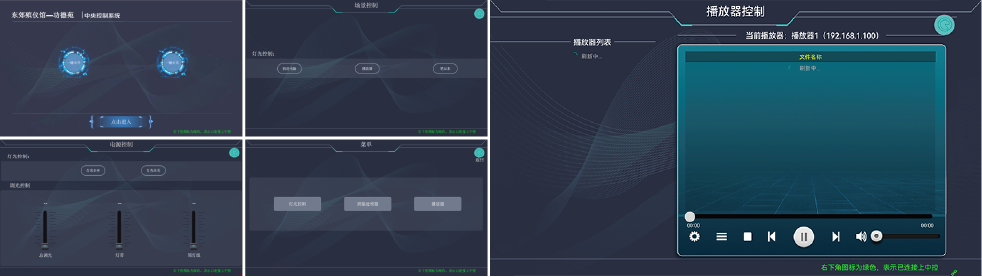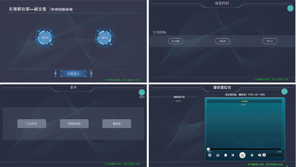 人机交互终端为智能礼仪厅应用管理平台提供了统一的可视化操作界面。平台将复杂的设备操作转化为直观的图形化交互,并依据告别仪式的标准流程,预设了“准备”、“默哀”、“瞻仰”、“送别”等一键式场景模式。工作人员仅需轻触对应场景,系统便会自动执行一系列组合指令,例如在“瞻仰”场景下,系统可同步调暗环境照明、点亮聚焦追光、降下电动幕布并开始播放悼念视频,所有动作精准同步、平滑过渡,彻底消除了多设备分头操作带来的手忙脚乱与潜在失误。与之配套的专业多媒体播放器管理界面,不仅支持高清视频、背景音乐等多种媒体格式的播放与列表管理,更实现了与中控系统的深度联动,确保影音内容与现场环境氛围的毫秒级精准配合。