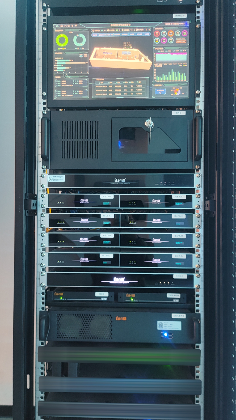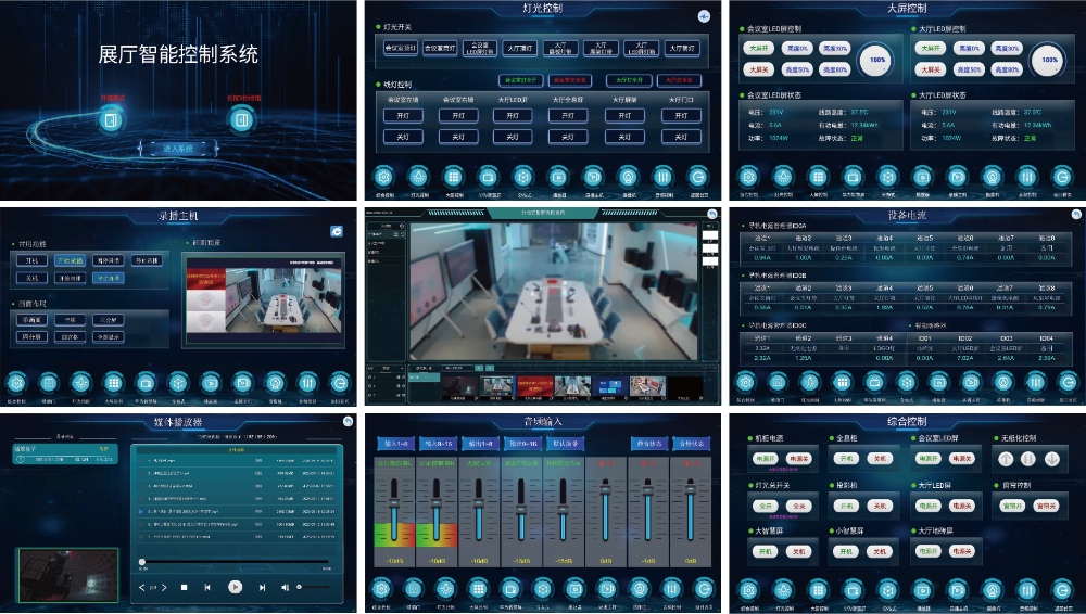 ITAV中央控制系统是一体化方案实现便捷管理与稳定运行的关键。它以中央控制主机为核心,通过高兼容且丰富的接口模块,将会议室与展厅内大屏显示、录播、会议摄像、环境照明、专业扩声、多媒体播放、无纸化升降器、分布式节点、电源等设备的控制链路汇入统一底层,构建了集中化的硬件管控基础,并通过深度集成的自研软件编程,将受控设备的开关、切换、调光、音量调节、信号切换、电源管理等各项独立操作进行模块化整合,形成直觉式操作的功能界面,并封装成“一键式”场景指令,见即所得。