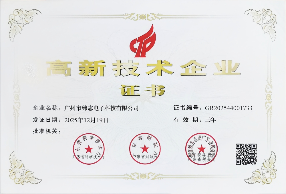 “高新技术企业”认证,被广泛视为衡量中国科技企业创新能力的最高标准之一。认定程序极为严格,需对企业知识产权、研发投入、科技成果转化能力、组织管理水平和成长性进行系统性、多维度的权威评审。纬志电子连续五次通过审核,充分证明了公司在自主创新体系、技术沉淀与市场应用等方面,始终保持着行业的领先水准与旺盛的发展活力。