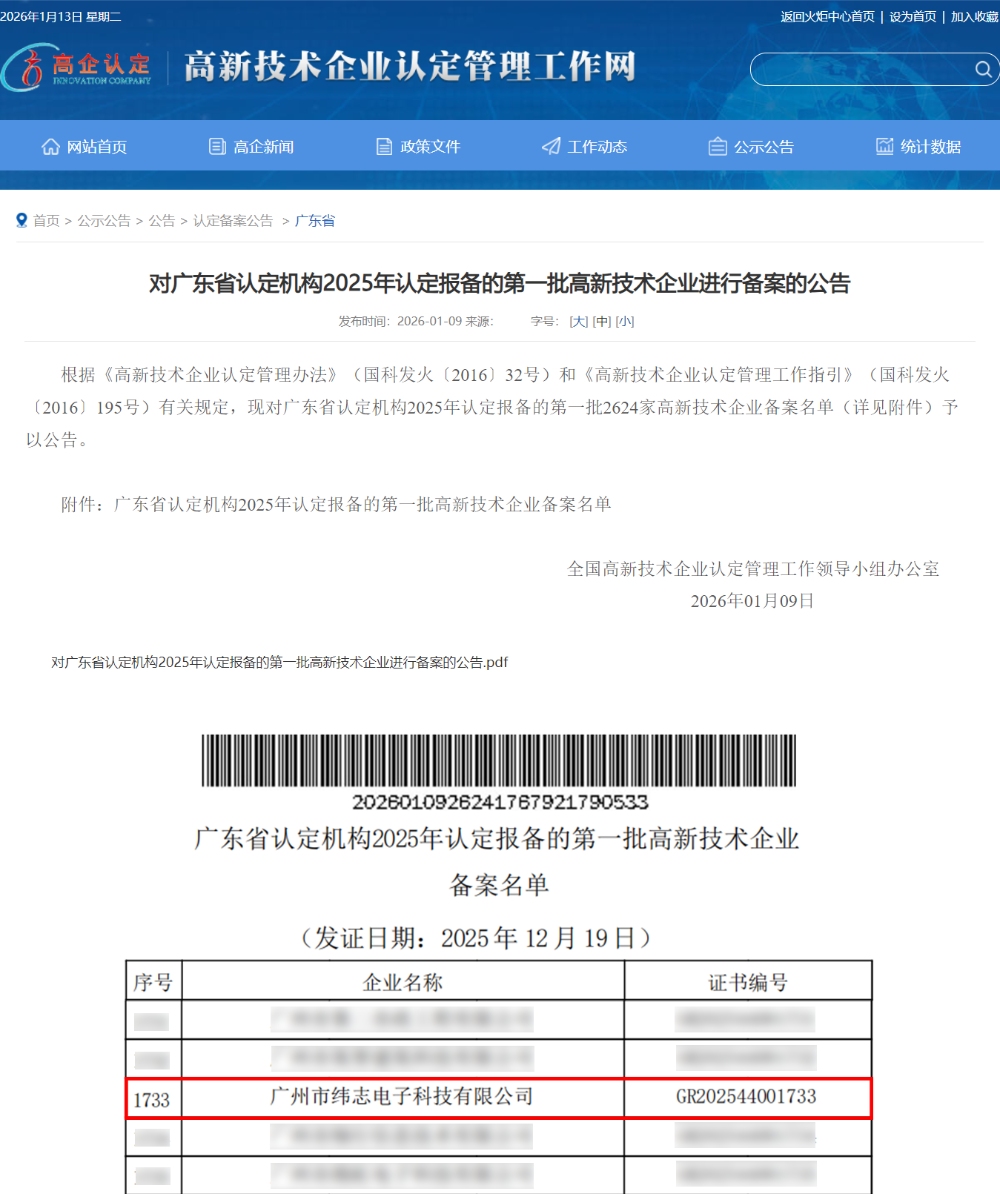 近日,广东省认定机构正式公告2025年第一批高新技术企业备案名单,广州市纬志电子科技有限公司(ITAV)凭借卓越的创新能力与扎实的研发积累,再次成功上榜。 这标志着公司已连续五次获此国家级殊荣,不仅是对纬志电子在核心技术自主创新、知识产权成果转化及高成长性方面的持续肯定,更是公司在专业领域内的深厚积累与长期坚持技术研发战略的有力印证。